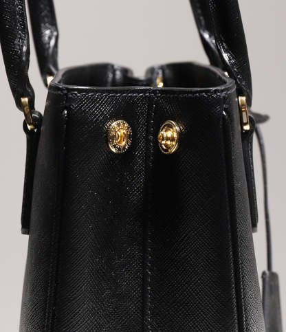 ★商品詳細・レザーハンドル・取り外し・調節可能なロゴプリント入り織テープのショルダーストラップ(長さ:85cm)・取り外し可能なレザーのファスナー付ポーチとキーリング・ゴールド仕上げのパーツ・フロントにエナメルメタルのトライアングルロゴ付・サイドにスナップ開閉式・プラダロゴのナイロンライニングにポケット2個付(1個はファスナー付)・底鋲付・高さ: 16cm・マチ: 10cm・幅: 22cm