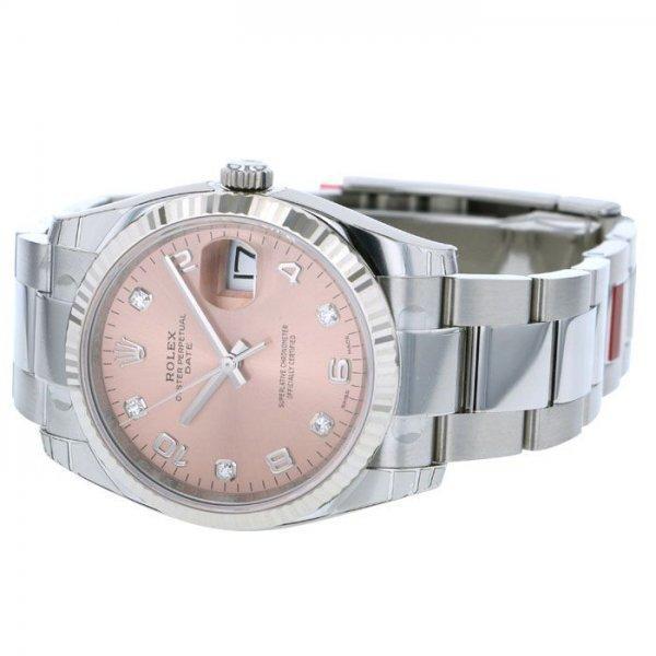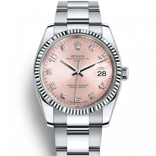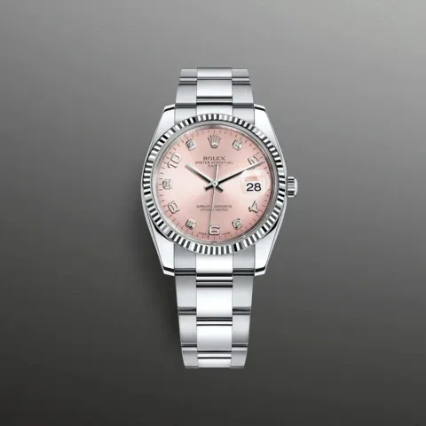 ホワイトロレゾールのオイスター パーペチュアル デイト 34はダイヤモンド入り、ピンクダイアルとオイスターブレスレットを備える。