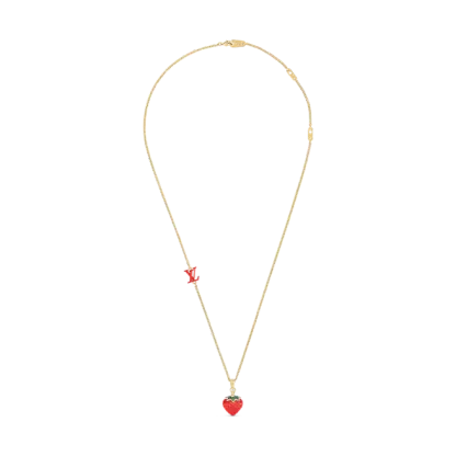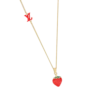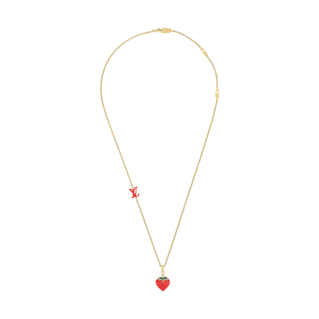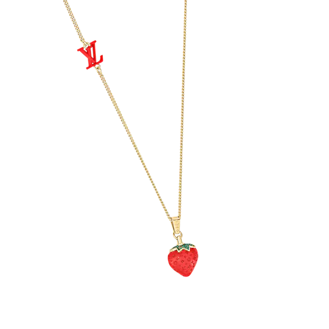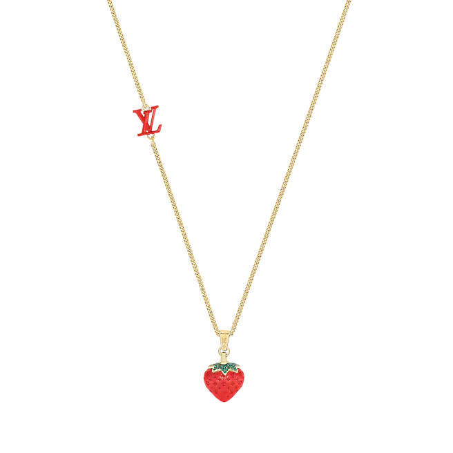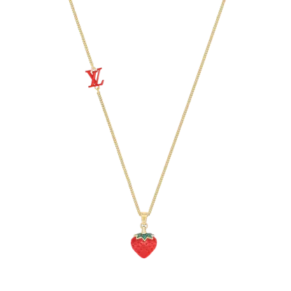 LVフルーツネックレスは、2022年春夏コレクションの楽しいフルーツテーマに焦点を当てています。 クラシックなモノグラムモチーフがストロベリーシェイプのエナメルペンダントに登場し、ハンドセットの透明なラインストーンとLVモノグラムの装飾が、ルイヴィトンの絶妙な職人技を際立たせています。