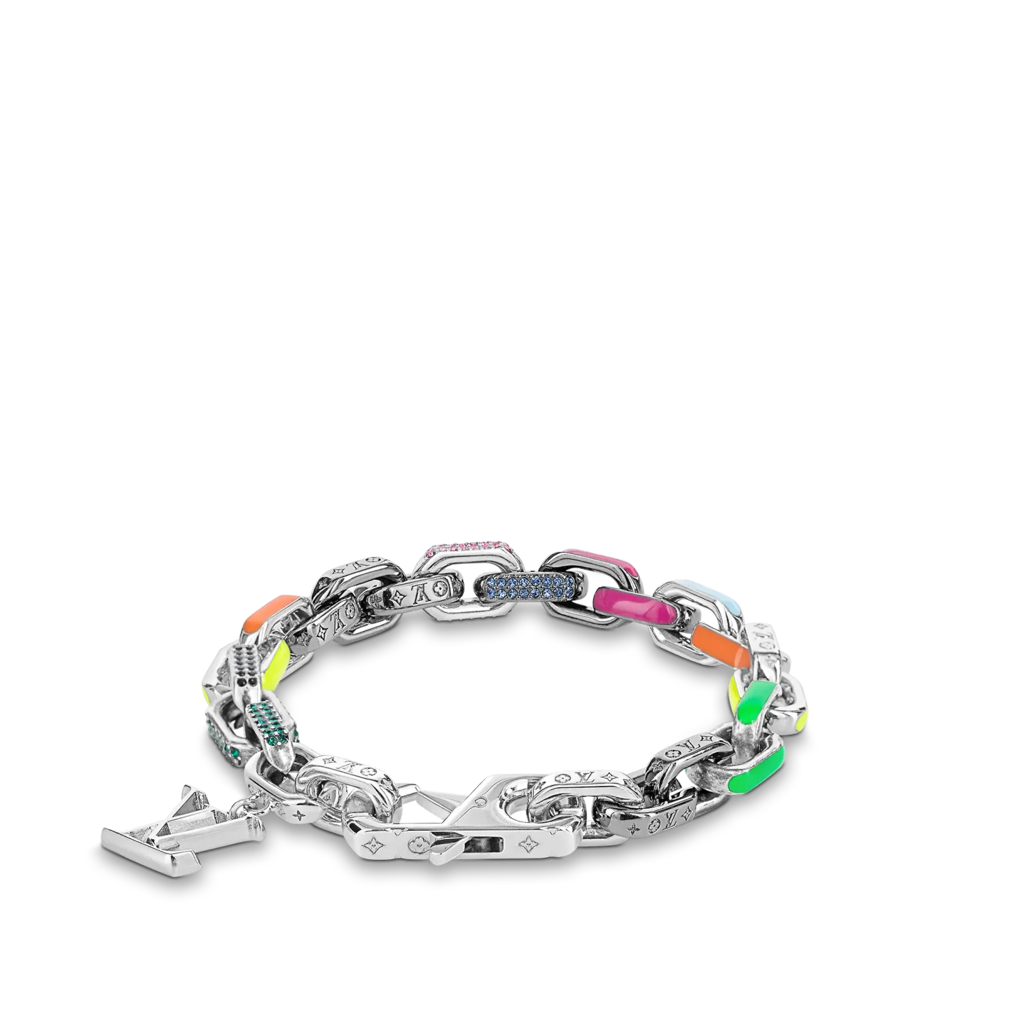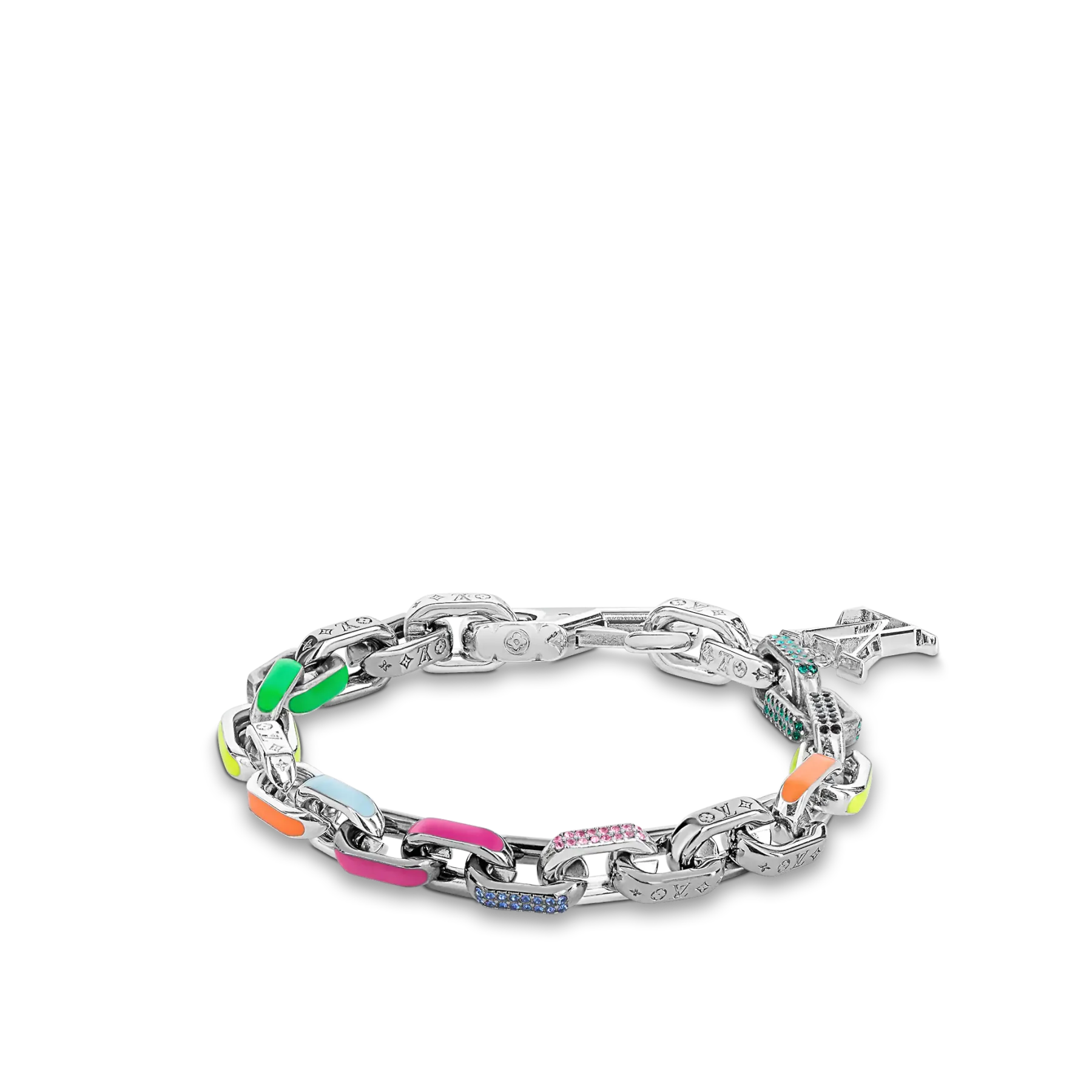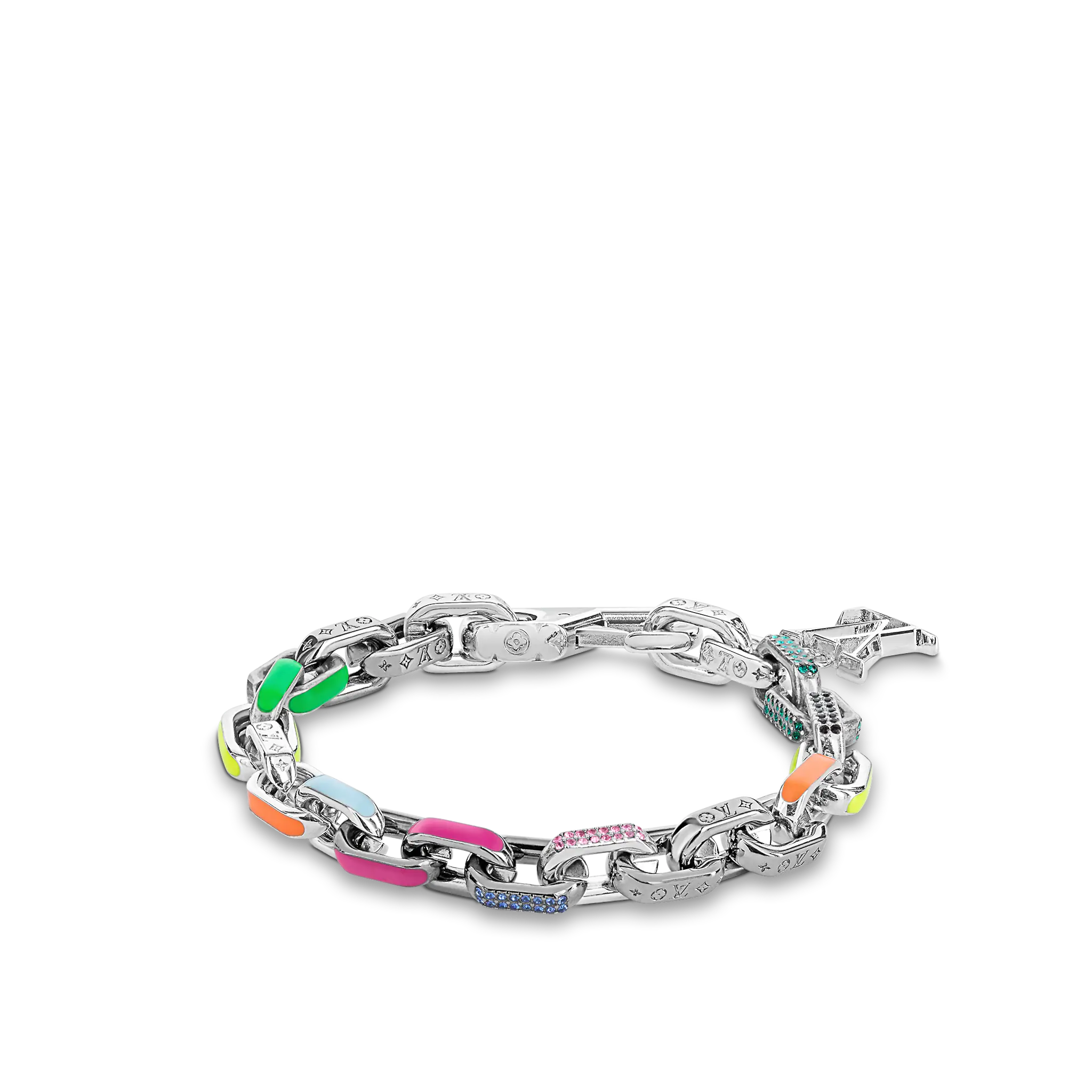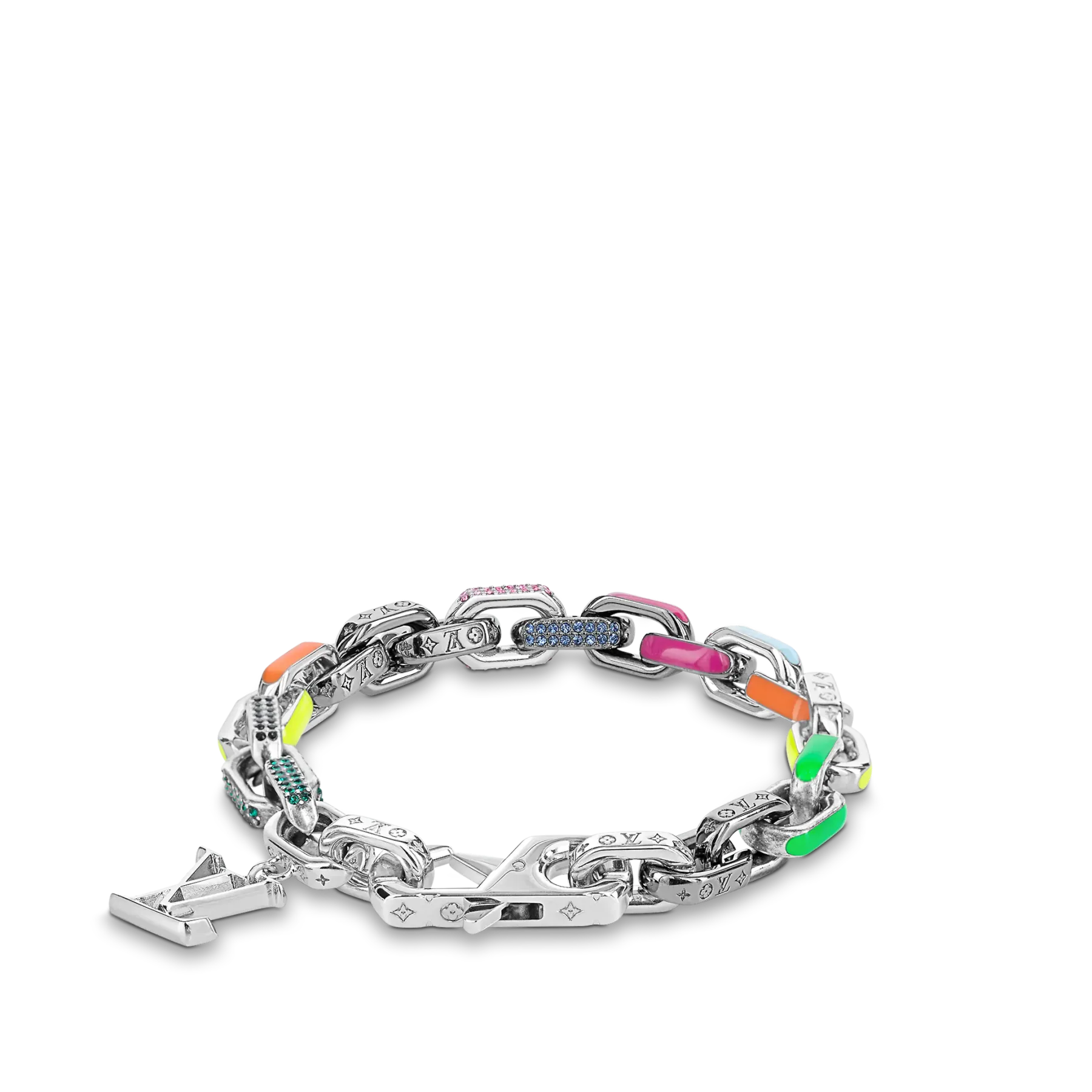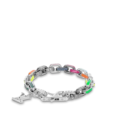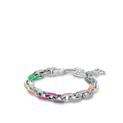 パラダイスチェーンブレスレットは、エナメルとガラスの豊かな色調と連動する頑丈なリンクが特徴で、質感と色の印象的な交差点を示しています。 チェーンリンクのモノグラムの刻印とLVモノグラムの魅力は、ブランドの絶妙な職人技を証明しています。