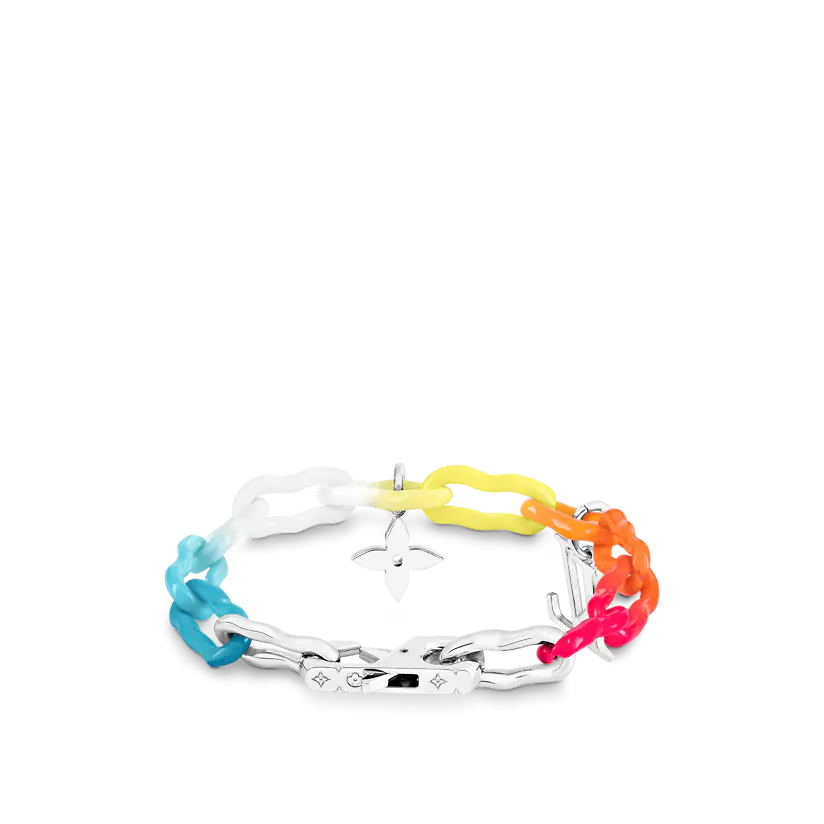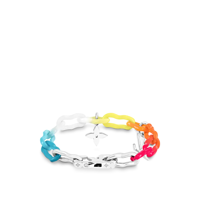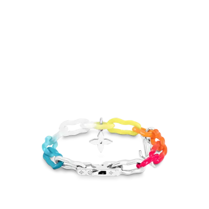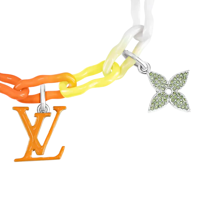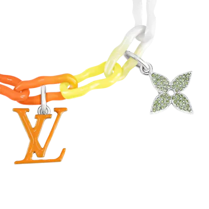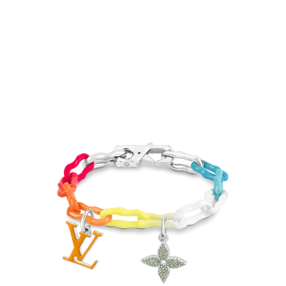 このレインボーチャームブレスレットは、今シーズンの水彩画のテーマに対応し、明るく鮮やかです。 セラミックチェーンベルトに明るいラッカーをコーティングするために特別な昇華技術が使用され、虹のような塗装効果を実現しています。 モノグラムの花飾りとLV文字飾りにはクリスタルがちりばめられており、この楽しいアクセサリーをよりエレガントにしています。