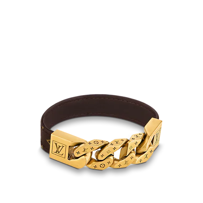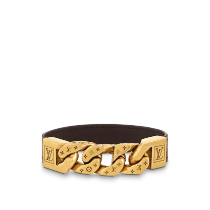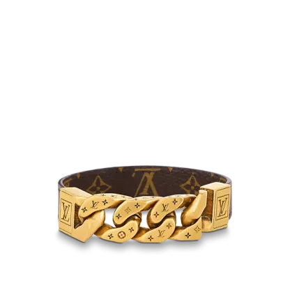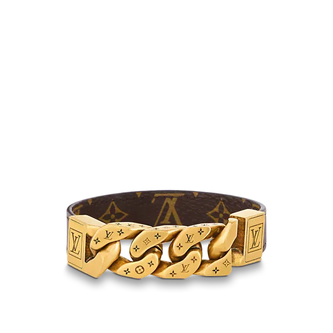 このMONOCHAINREVERSOブレスレットは、さまざまな素材のファッショナブルなミックスとマッチで絶妙な意味合いを示しています。 ブレスレットの片面は控えめでスタイリッシュな無垢のカーフスキンで作られ、もう片面は象徴的なモノグラムキャンバスで作られています。 ユーズド加工された金属部分には、ルイ・ヴィトンの英語のロゴと非常にレトロなモノグラムパターンが正確に刻印されています。
